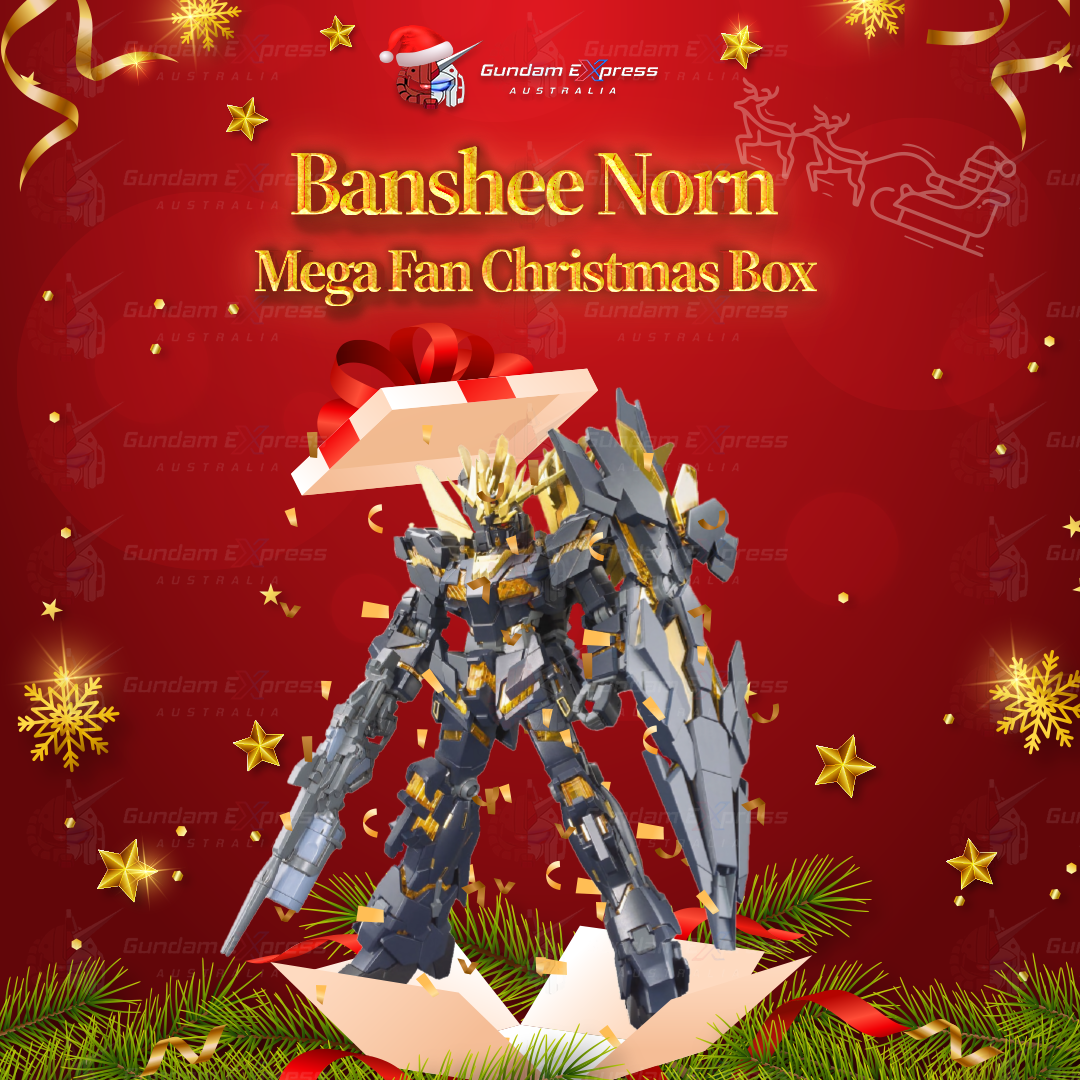 In this Mega Fan Christmas Box you'll guaranteed to receive the Bandai 1/60 PG RX-0 Unicorn 02 Banshee Norn kit PLUS a range of Banshee Norn themed merch.
