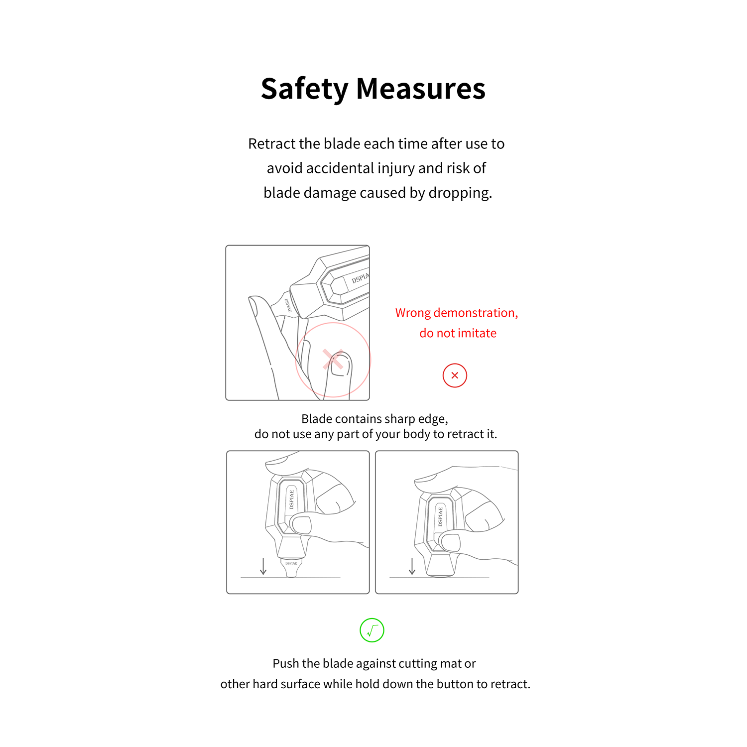 The blade is concealed which is released/retracted via a push button mechanism, ensuring safety against accidental injury via the blade.