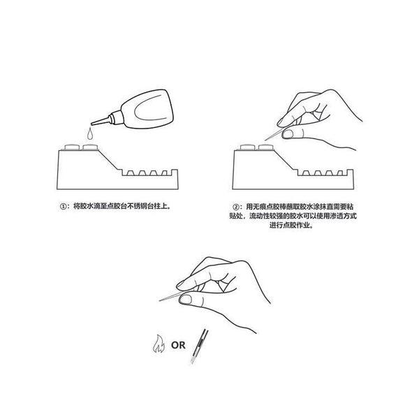 With the CA dripped onto the platform(s), your applicator of choice is then used to touch the edge of the superglue pool, filling up the small reservoir. You will then transfer this to your project work, with the CA running from the applicator via capillary action. You can use the racks to store the applicators, and when finished, DSPIAE suggest holding the tip of the applicator in a flame, to burn away any remnants of glue and leave it clean for your next use.