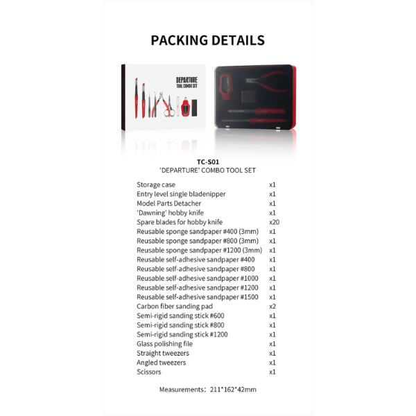 The TC-S01 Departure Hobby Tool Combo Kit is the perfect starting point for any modeler or hobbyist. This comprehensive set includes a wide range of essential tools to help you bring your projects to life.