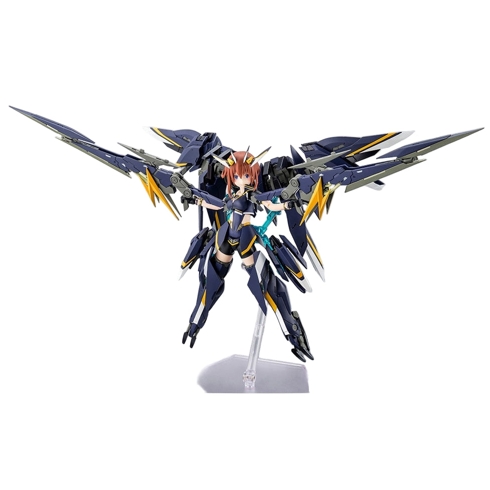 Her massive "Magnum Ops" weapon incorporates a transformation and combination mechanism, and it can be displayed in any of three forms! She's also armed with a rifle, a one-handed sword, and other weapons. She can also be displayed without any armour or weapons if you prefer.