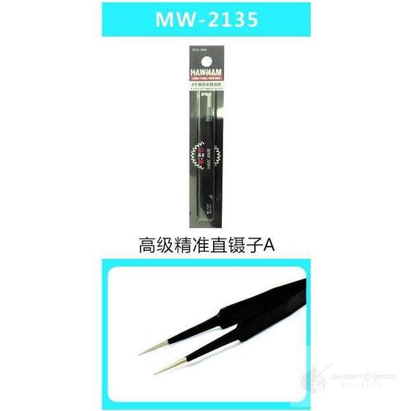 A pair of precision straight tweezers with fine tips for delicate work such as applying decals and placing fine pieces.