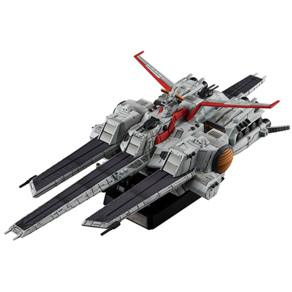 This pre-painted finished item features weathering for a more realistic appearance, as well as waterslide decals. It comes with its base for display, plus seven mini in-scale Mobile Suits. The Hyper Mega Particle Cannon firing mode can be reproduced, and the turrets can be rotated as well. Parts for opening and closing the MS hatches on the left and right catapult decks are included, so you can display the Mobile Suits on the catapult decks as if they're ready for launch.