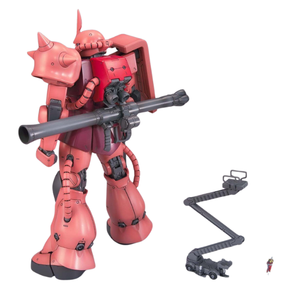 3. Full Arsenal: Equipped with Char's signature weaponry: a Zaku machine gun, bazooka, and heat hawk for a complete battle setup.