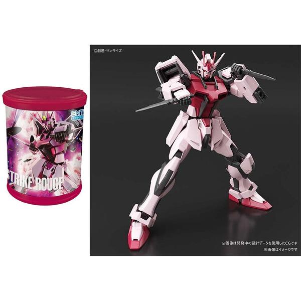 Build the iconic Strike Rouge Gundam with ease, equipped with Armor Schneider, in a collectible round container.