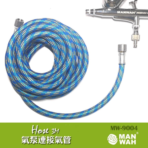 Manwah MW-9004 is a 3 metre long hose, rubber internal construction with fabric braided outer. Will fit MW-9001 airbrush. Coupling ID 1/8"