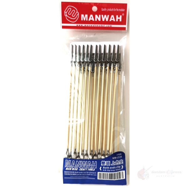 Manwah Both End Painting Clips 35mm Wooden 24 pieces per packet. Handy clips that can clip onto the edge of a box lid for example and the other onto the part you wish to work on.