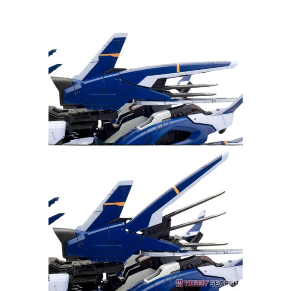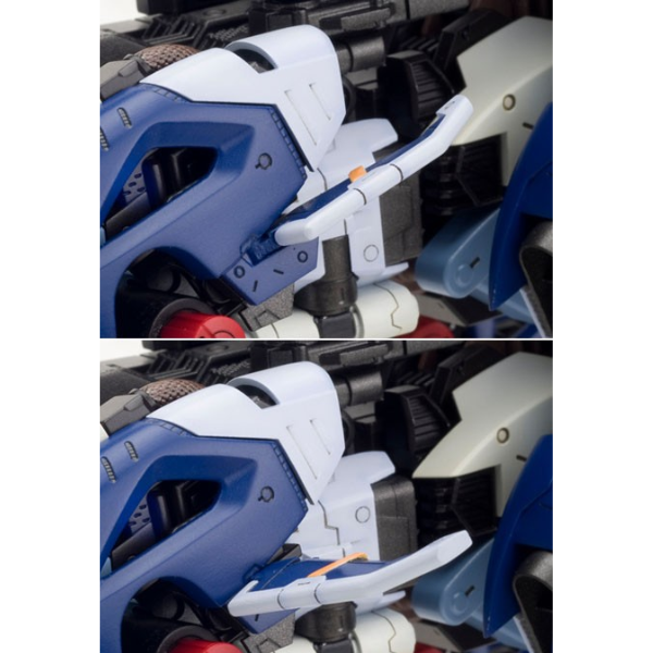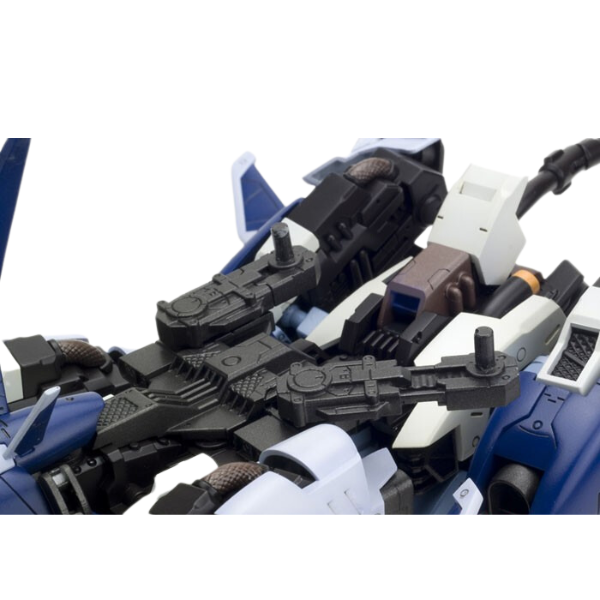 In all seriousness, this is a mean-looking machine. The external appearance can be altered with the included Jager unit, so you basically get two final products in one kit! The armour is a distinctive navy color, and the large boosters on the back are striking in appearance. The large adjustable booster ion can move horizontally and vertically, as can the other wings on the back and hind legs. The armour wing and side thrusters also expand! And of course, the Strike Laser Claw can be recreated. We love this kit!