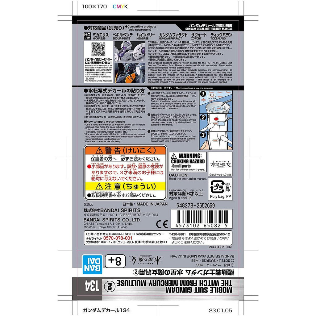 The Gundam Decal No.134 Mobile Suit Gundam: The Witch from Mercury 2 is compatible with 1/144 scale Gundam models from the Mobile Suit Gundam: The Witch from Mercury anime series. These decals are designed specifically for the HG (High Grade) and MG (Master Grade) model kits, ensuring a perfect fit and enhancing the overall appearance of your Gundam models.