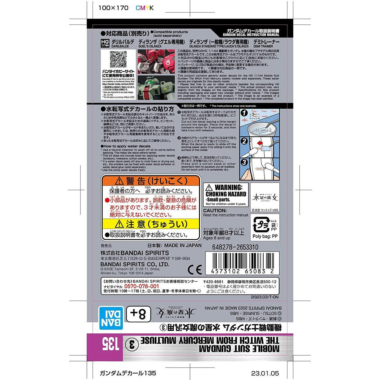 Customize Your Mobile Suit Models with Authentic Markings: Bring your Gundam model kits to life with the 1/144 Witch From Mercury 135 Multiuse Decal Set 3. These high-quality water-slide decals provide a vast array of markings and designs inspired by the Mobile Suit Gundam: The Witch From Mercury anime series, allowing you to personalize your models with accuracy and detail.