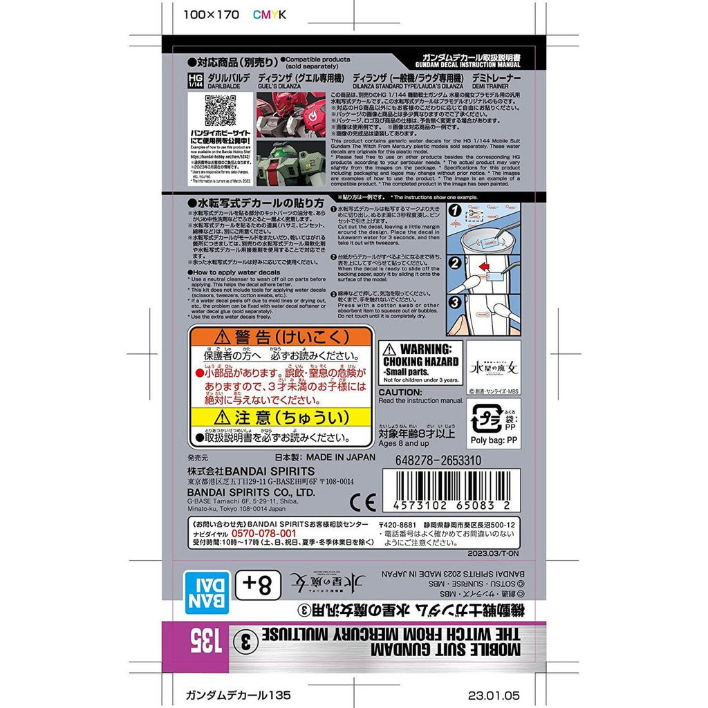 Unleash the authenticity of your Gundam model kits with the 1/144 Witch From Mercury 135 Multiuse Decal Set 3. Customize your models with accurate markings, enhance realism with intricate details, and achieve a flawless finish with effortless application. Transform your mobile suit collection into masterpieces of anime realism.