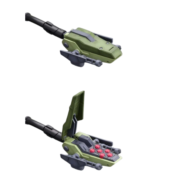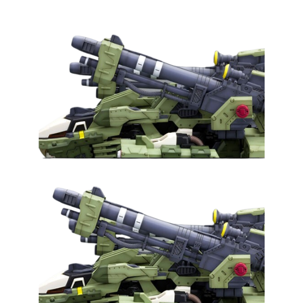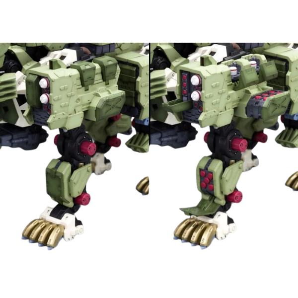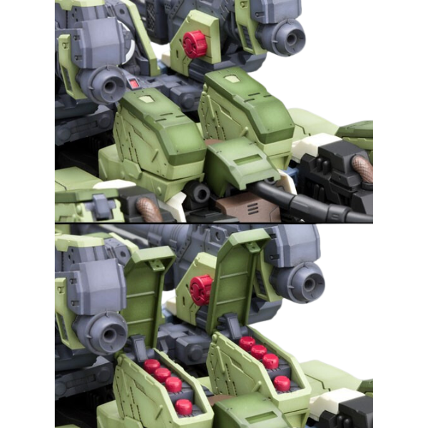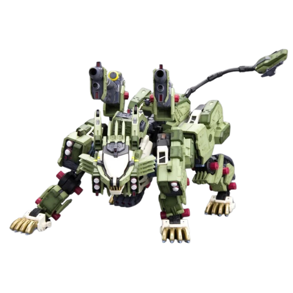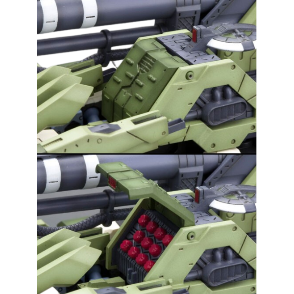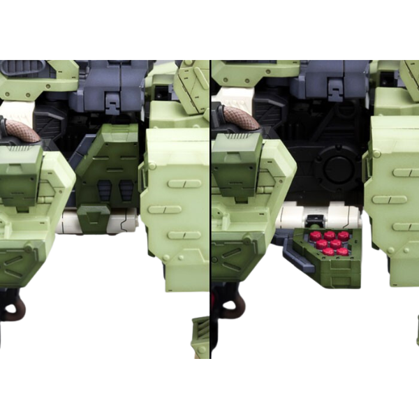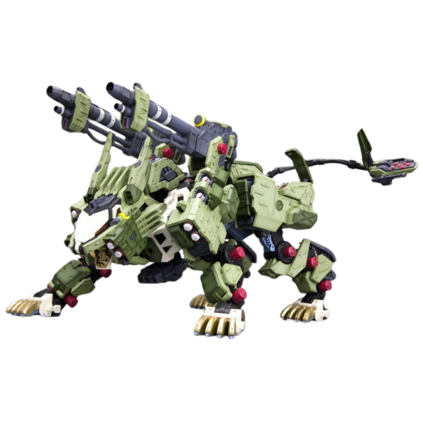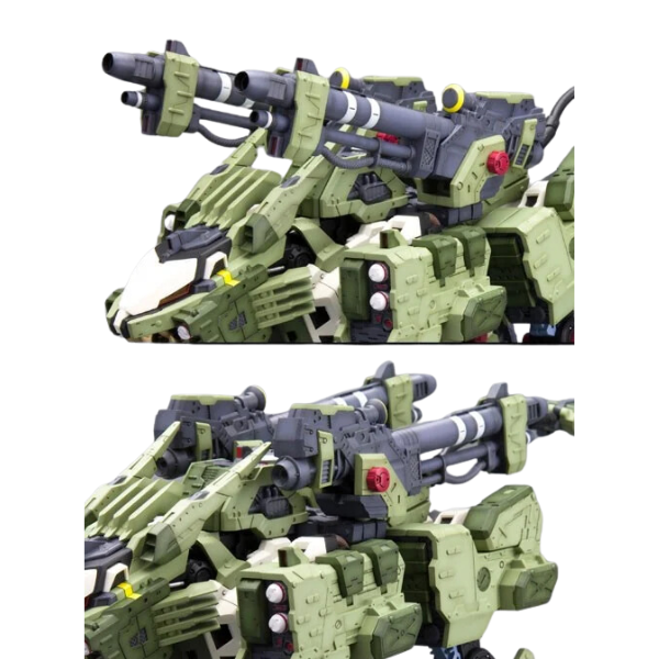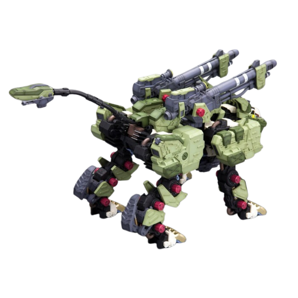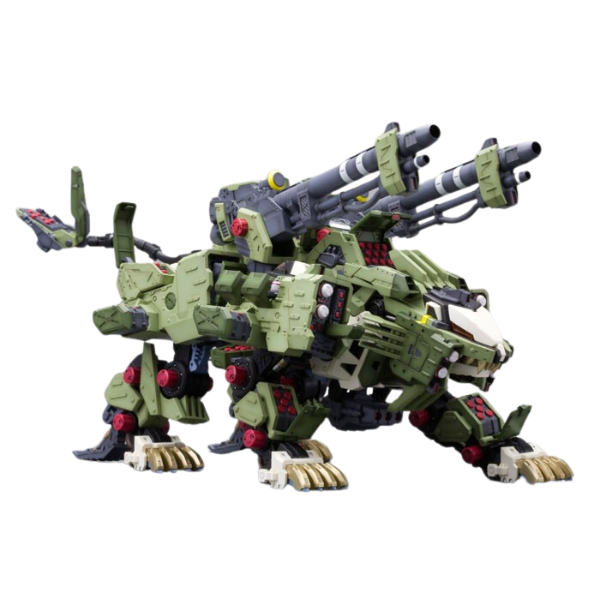 The Liger Zero Panzer, the forms of heavy shelling armour system of Liger Zero that appeared in Zoids New Century Zero slash is here! 22 Expandable missile ports are installed to the legs, torso, and back. This thing is a mean green shootin' machine and comes with more weapons than you can shake any of the other Zoids kits.